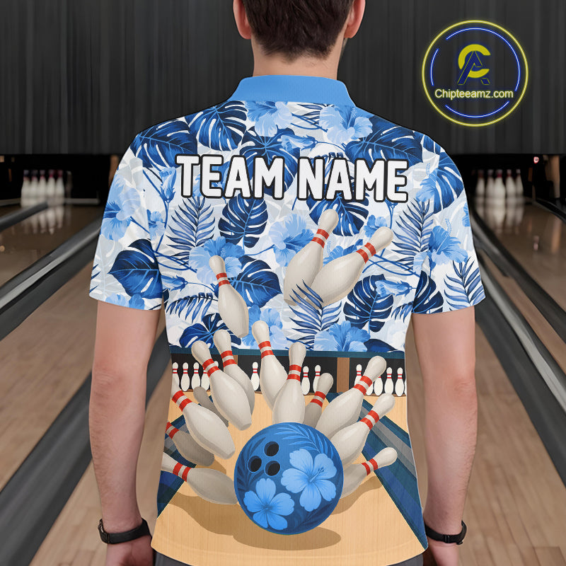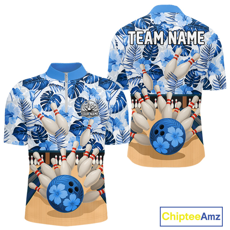 Blue tropical flower Bowling Polo, Quarter Zip Shirts For Men Custom bowling team jersey NQS10988
