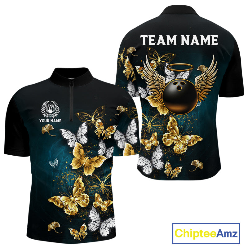 Custom Gold Butterflies Bowling Shirts For Men, Personalized Team Bowling Polo & Quarter-Zip Shirts NQS10577