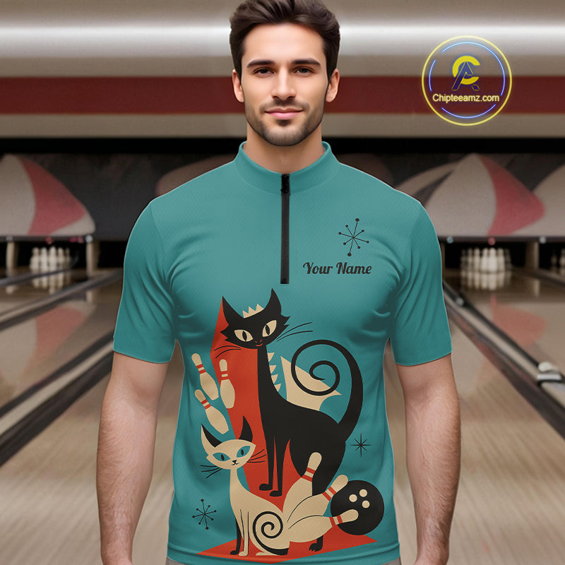 Custom retro bowling shirts Cat Bowling jersey for men Team Bowling Polo, 1/4 Zip Shirts | Blue NQS11072