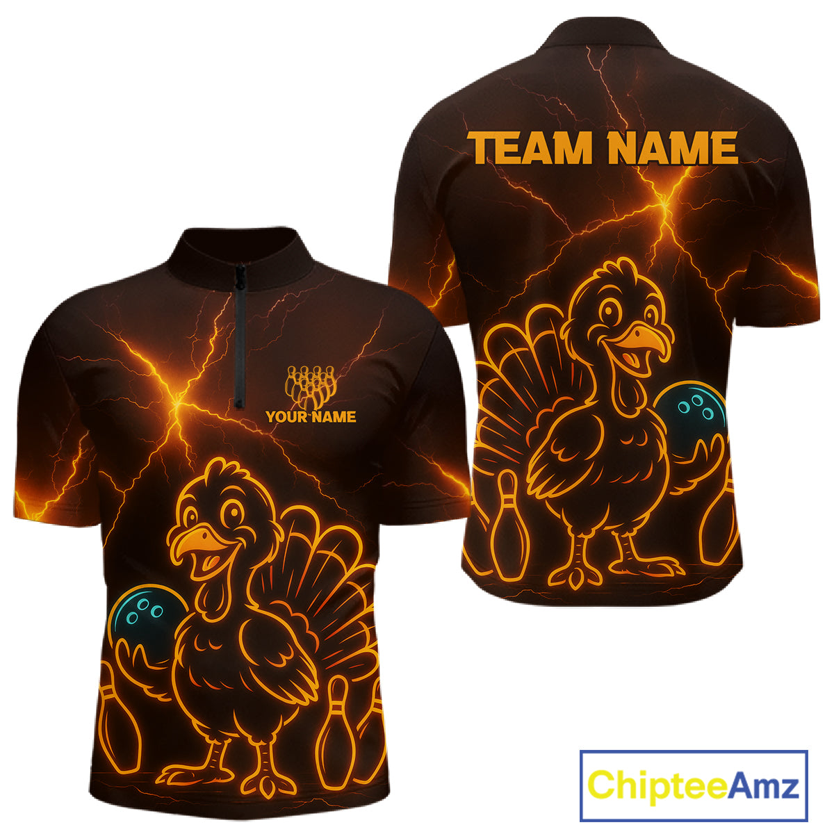 Orange Lightning Thunder Turkey Bowling Shirts For Men Custom Thanksgiving Team Bowling Jerseys NQS10682