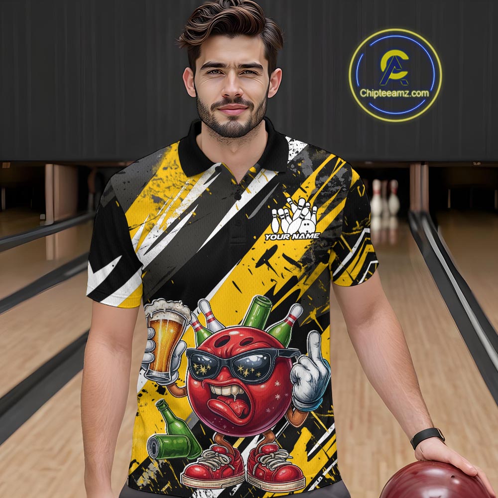 Custom Funny Bowling Ball Drink Beer Bowling Men Polo Shirt, Grunge Yellow Team Shirt IPHW10119