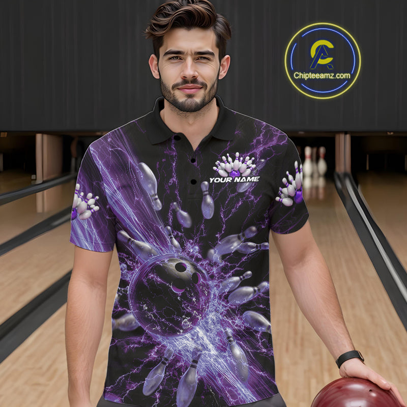 Custom Purple Thunder Lightning Bowling Team Men Polo Shirts, Bowling Jerseys IPHW9744