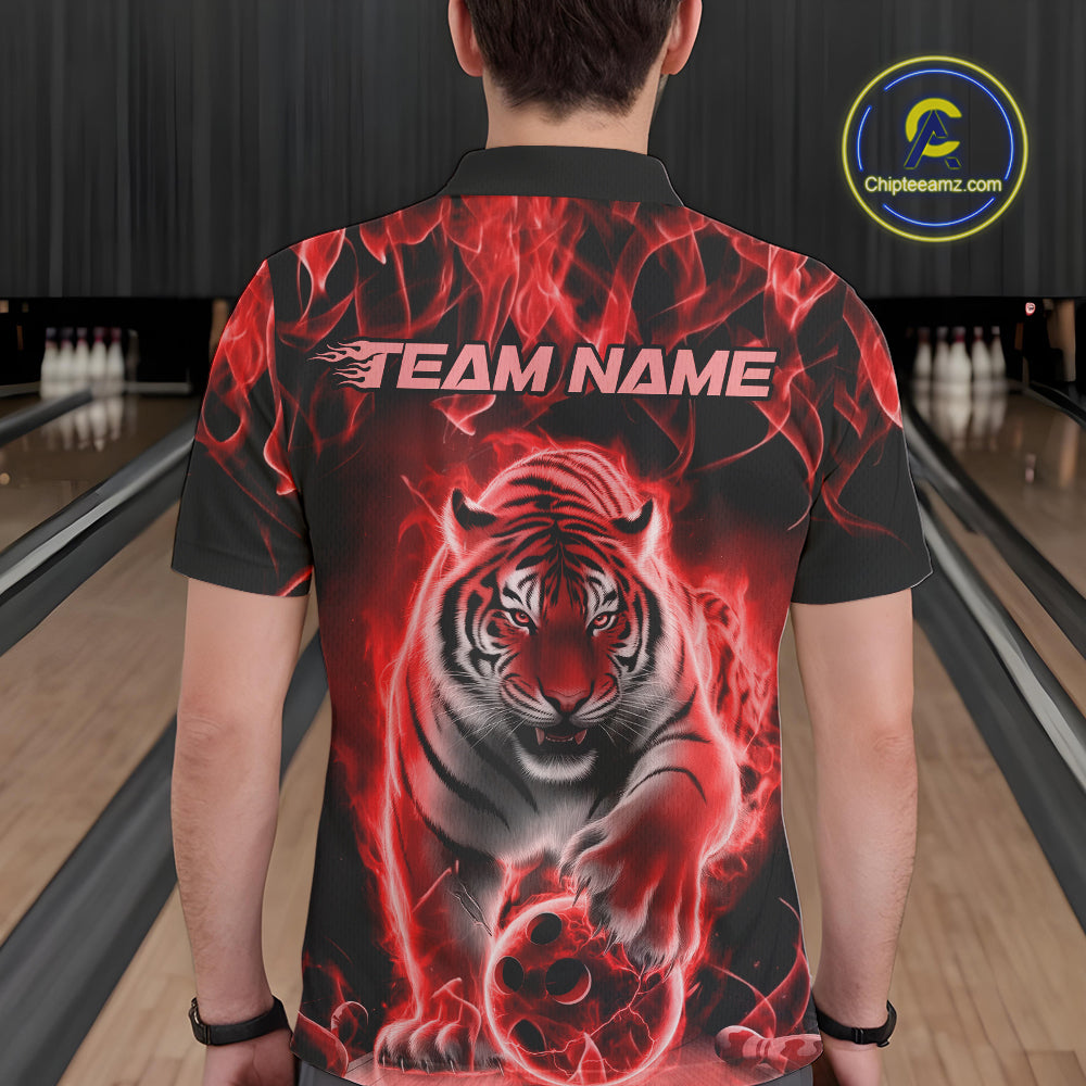 Custom Red Flame Tiger Bowling Polo Shirts For Men, Tiger Bowling Team Shirt IPHW9762