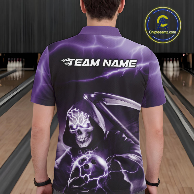 Custom Purple Lightning Grim Reaper Bowling Polo Shirts For Men, Halloween Bowling Jerseys IPHW9847