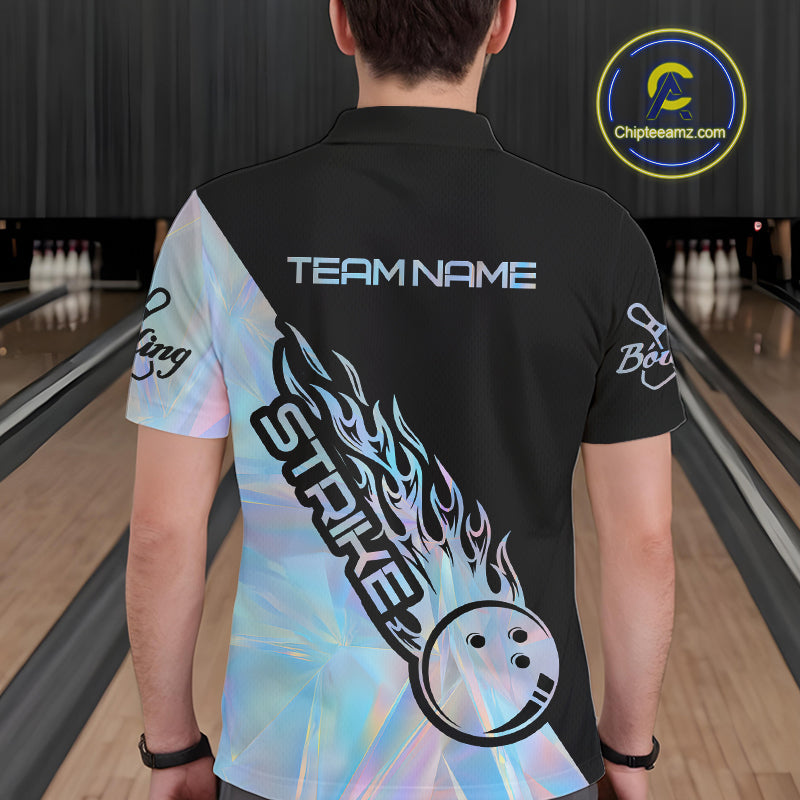 Custom Hologram Flame Strike Bowling Men Polo Shirt, Holographic Icy Crystal Bowling Shirt IPHW9862