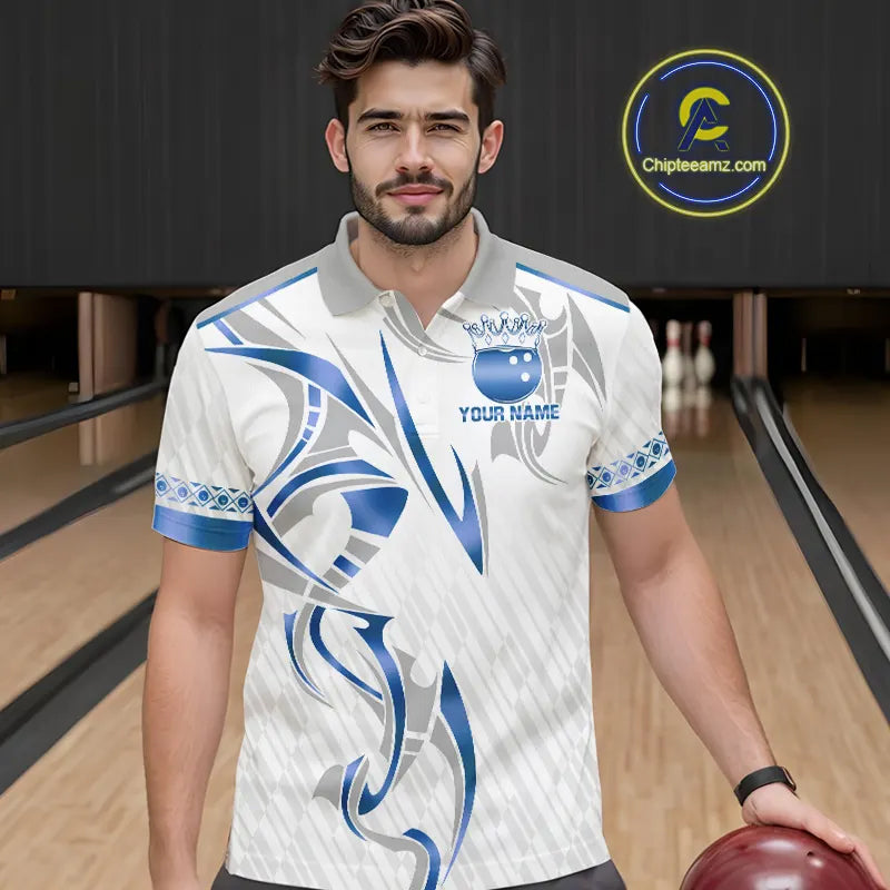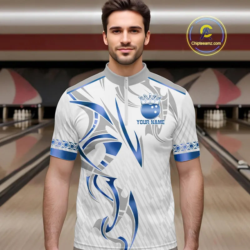 White and Blue crown Bowling ball Polo, Quarter Zip Shirts for Men Custom Bowling Team jerseys NQS11008
