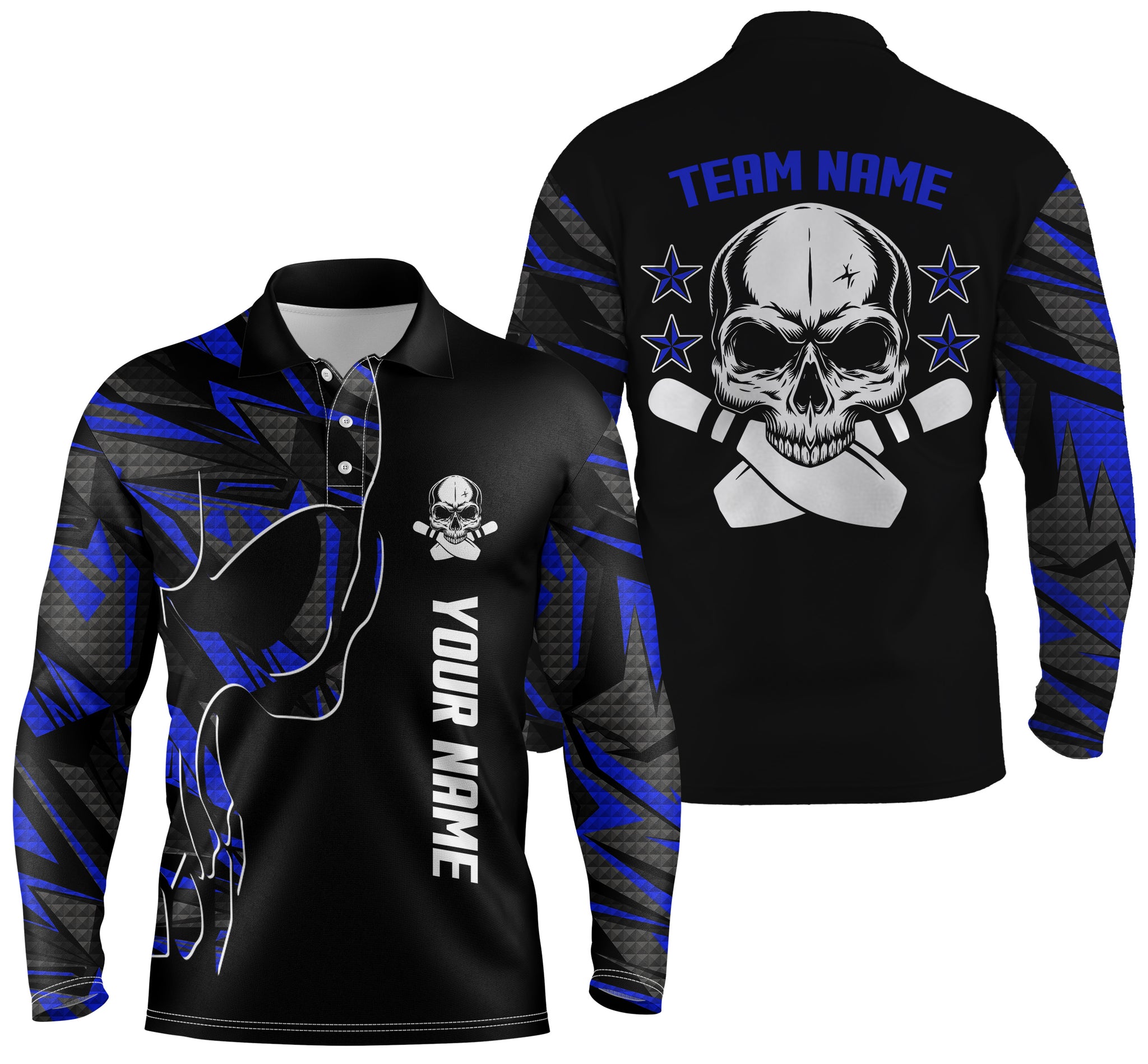 Bowling polo shirts for men custom name and team name Skull Bowling, team bowling shirts | Blue NQS4553