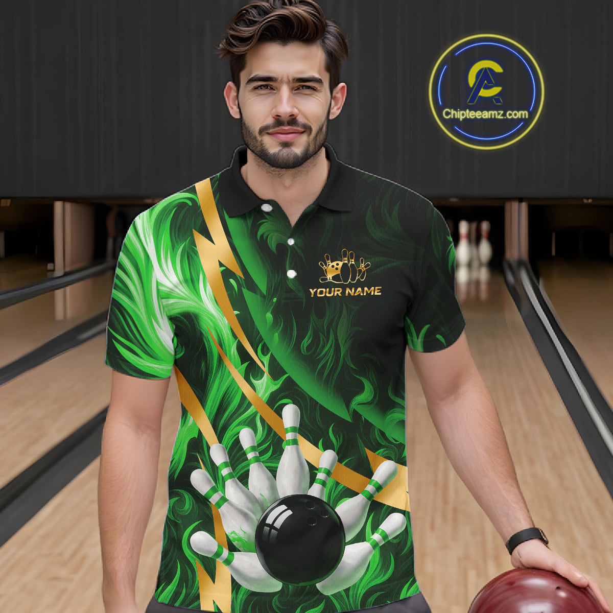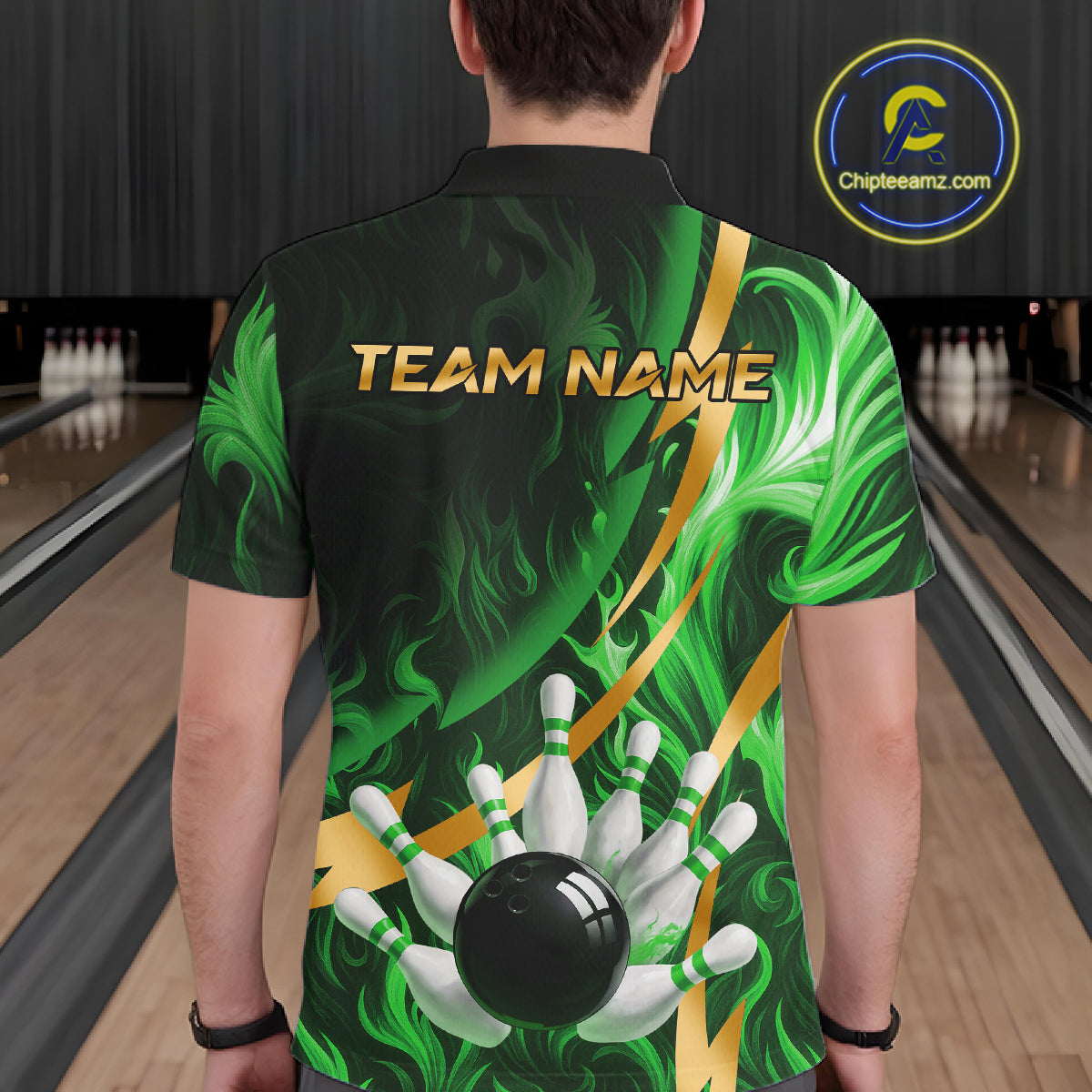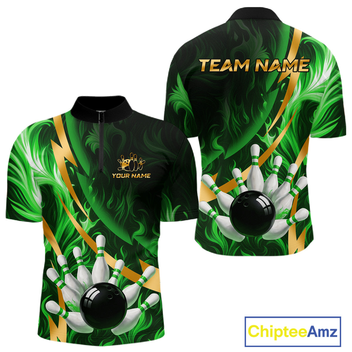 Personalized Bowling Polo, Quarter Zip Shirts for Men Custom Green Flame and Gold Bowling Team Jersey NQS11145