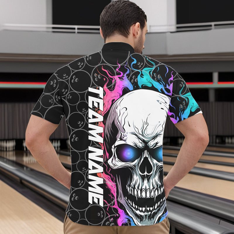 Custom Blue And Pink Flame Skull Bowling Men Quarter-Zip Shirts, Bowling Pattern Team League Shirt IPHW8853