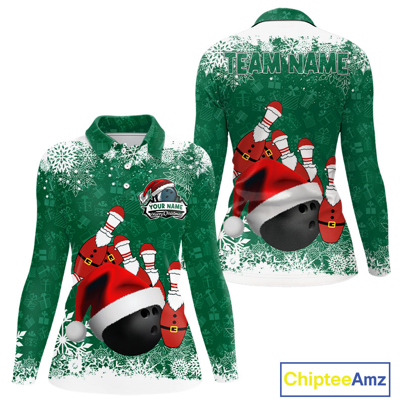 Womens bowling shirts Custom Funny Christmas snowflake Santa Bowling Ball pins Team Jersey | Green NQS11143
