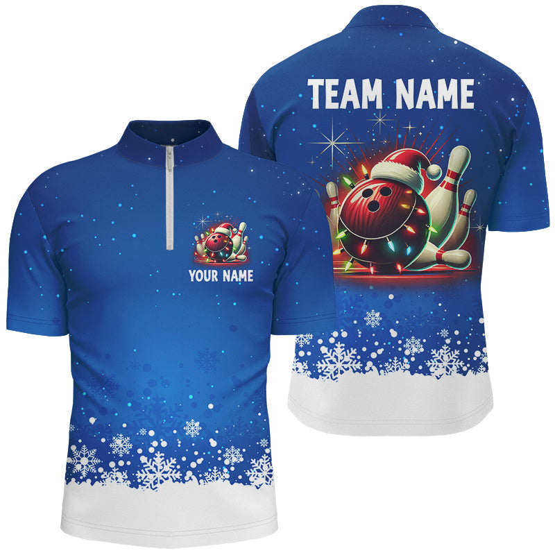 Christmas bowling Polo, Quarter Zip shirts For Men Custom Xmas Team Bowling Jerseys | Blue NQS8964