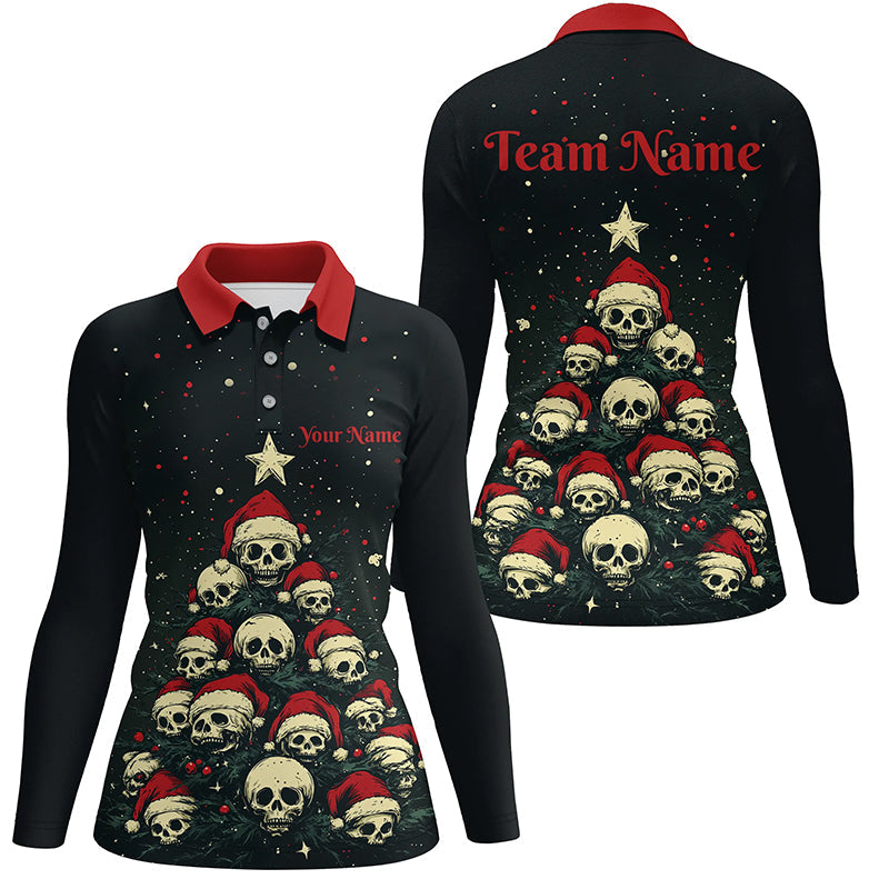 Funny Skull Christmas Tree Women Bowling Polo, Quarter Zip shirts custom Xmas Team bowling jerseys NQS8836