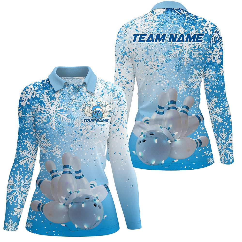 Blue Snowflake Custom Christmas Bowling Shirts For Women, Xmas Bowling Team Uniform IPHW7863