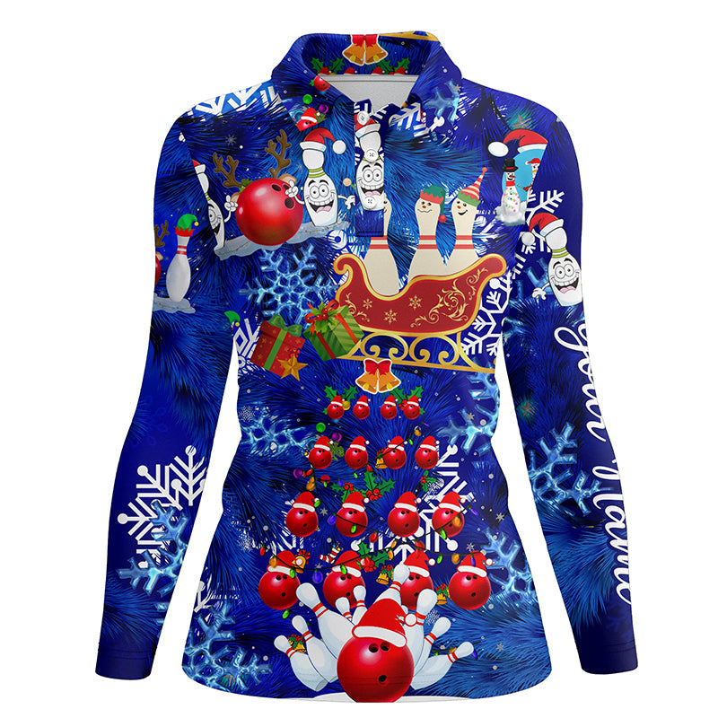 Womens Bowling Polo Shirts Custom blue Christmas pattern Bowling Santa ball pins team Ladies Jersey NQS6617