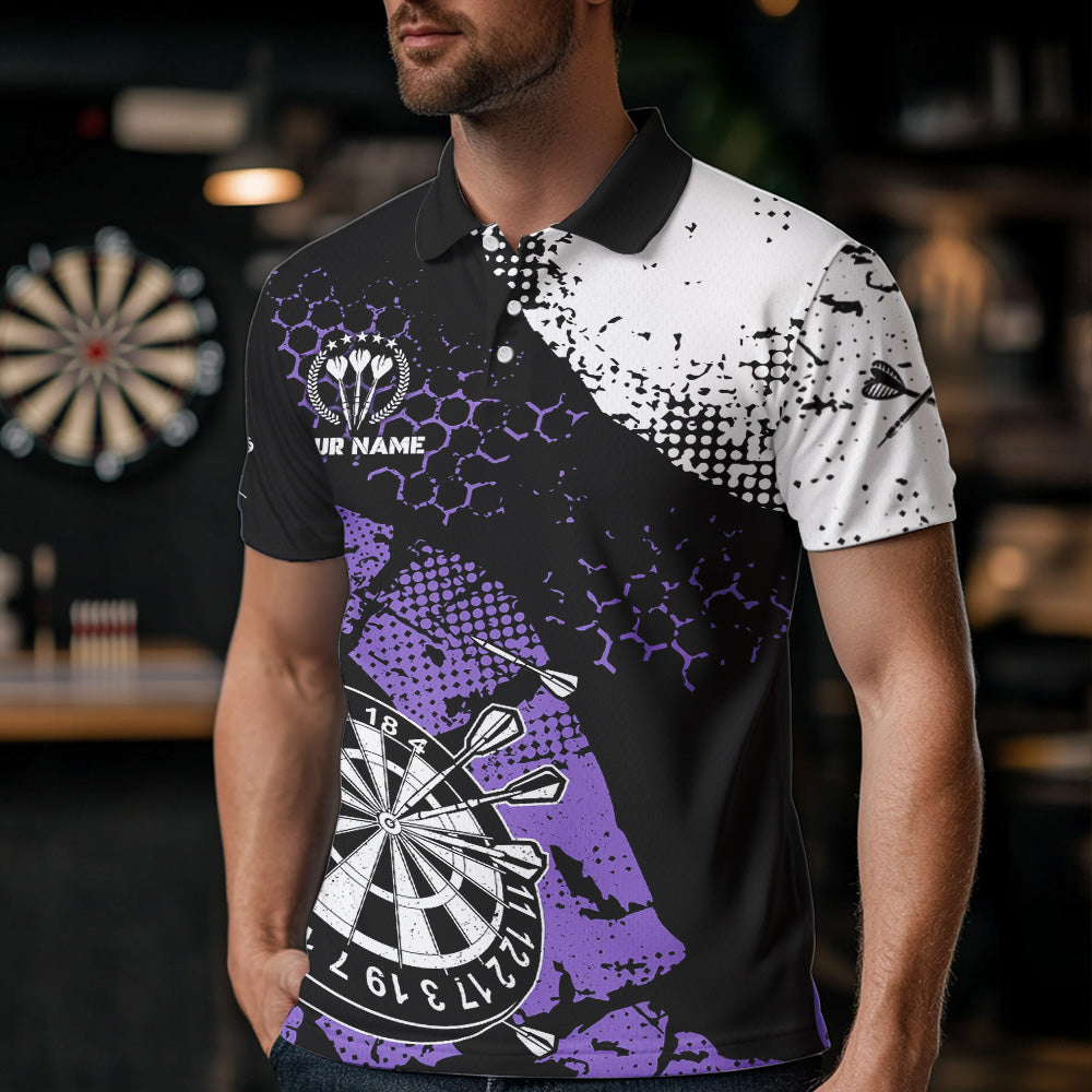 Retro Black Purple Grunge Pattern Darts Polo, Quarter Zip Custom Men Dart Shirt Team Dart Jersey TDM3593