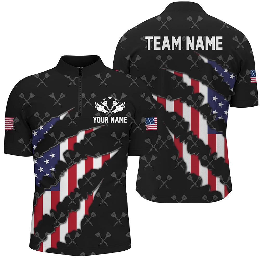 Personalized American Flag Darts Pattern Men Polo & 1/4 Zip Shirts, Black Patriotic Dart Jerseys TDM2728