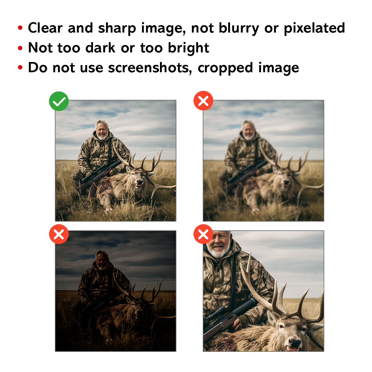 Please use a clear and sharp image, not blurry or pixelated, and not too dark or too bright. Please do not use screenshots or cropped images. A preview will be sent to you via email before production.