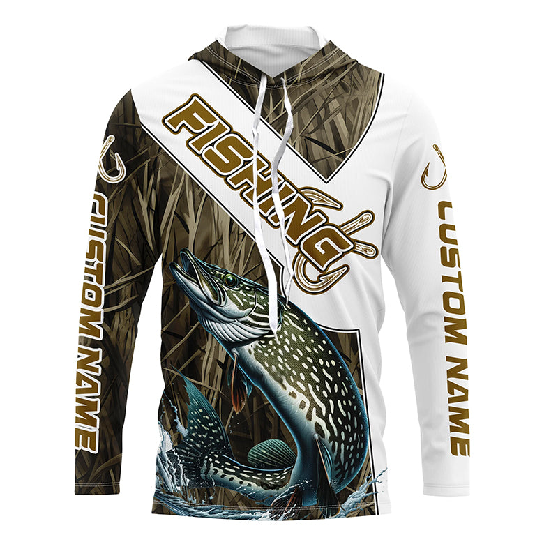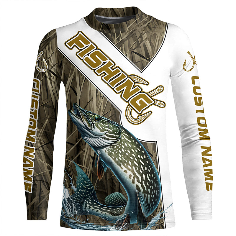 Pike Fishing Fish Hook Custom Long Sleeve Shirts, Pike Jerseys Fishing Gifts | Grass Camo IPHW6662