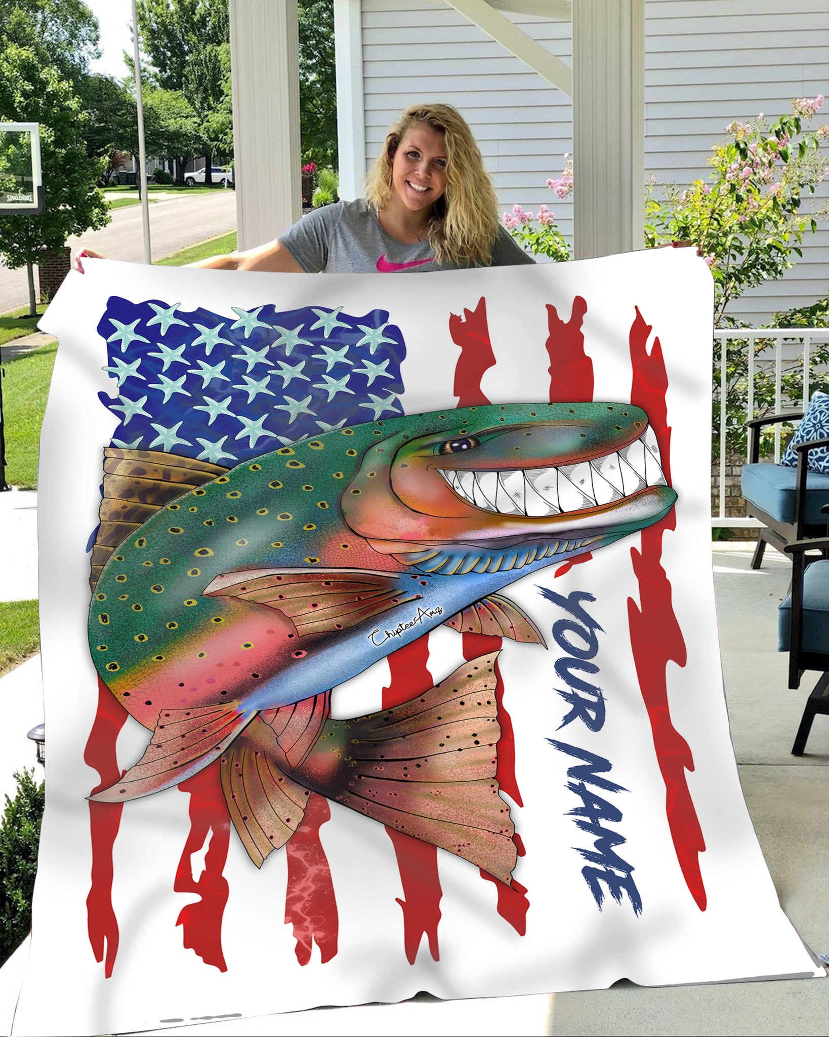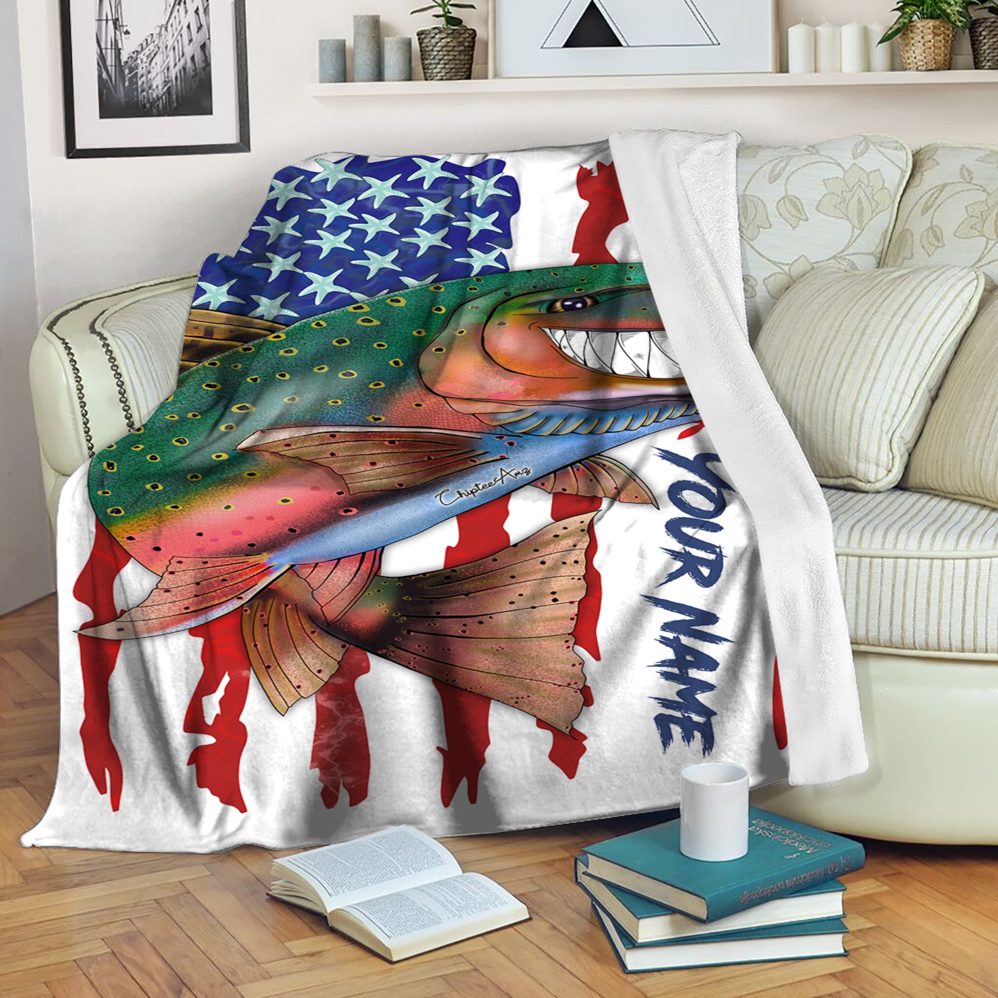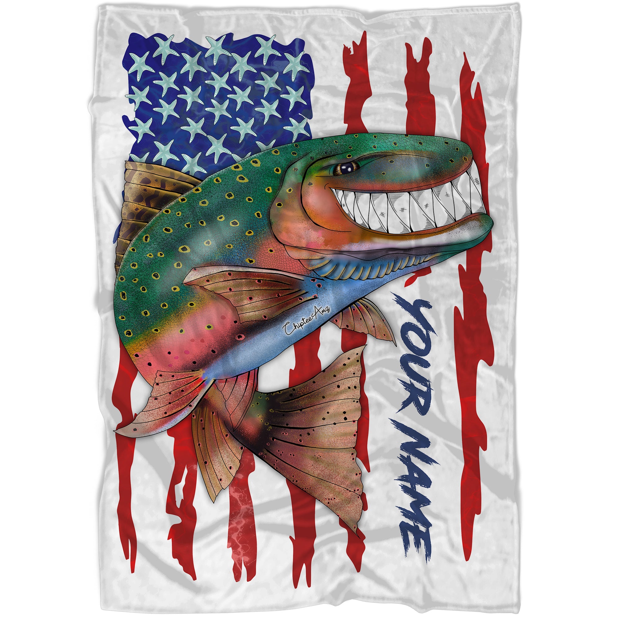 Trout fly fishing American flag funny rainbow trout ChipteeAmz's art custom name throw fleece blanket AT051