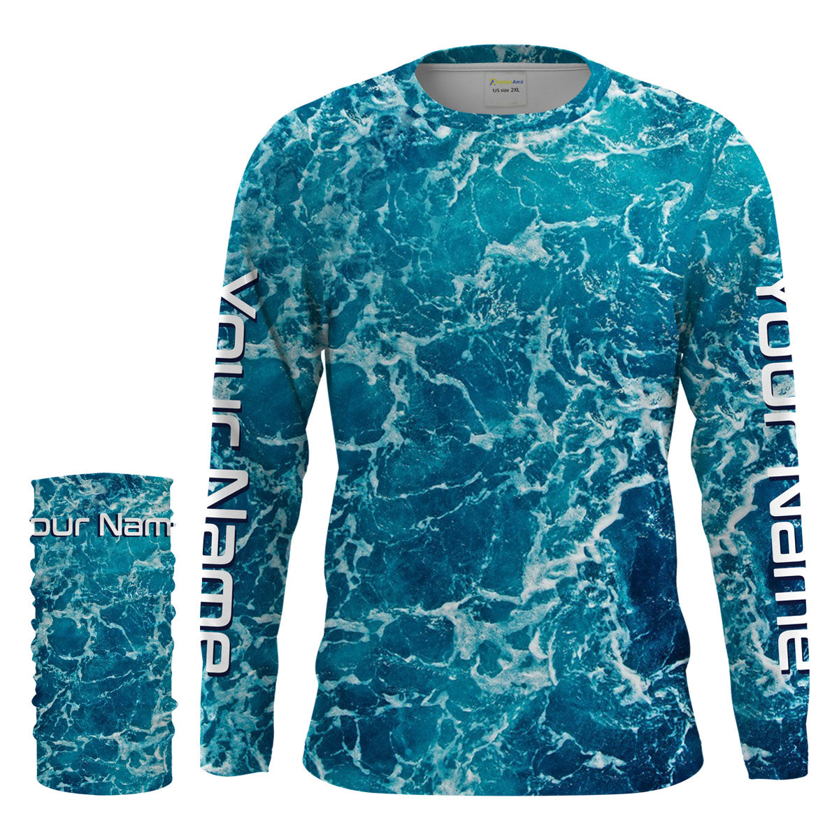 Custom Saltwater Long Sleeve performance Fishing Shirts for anglers | teal blue  Sea wave camo Fishing jerseys - IPHW1328