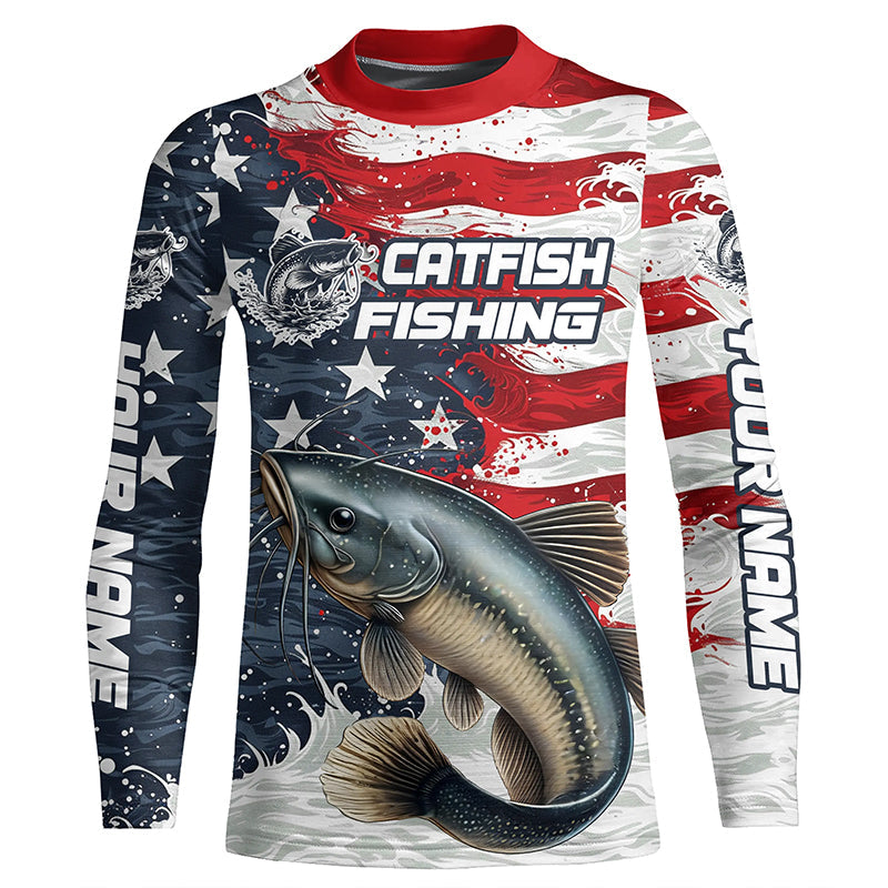 Catfish Fishing Custom Long Sleeve Fishing Shirts, American Flag Patriotic Catfish Fishing Shirt IPHW7013