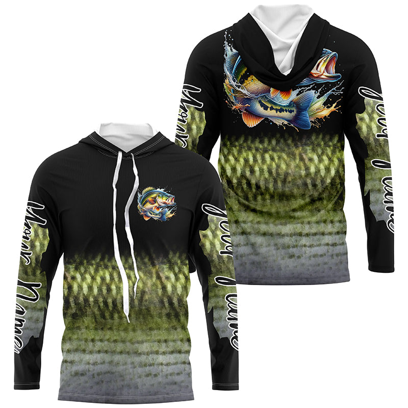 Largemouth Bass fishing Custom sun protection black long sleeve fishing shirts, Bass scales jerseys NQS4130