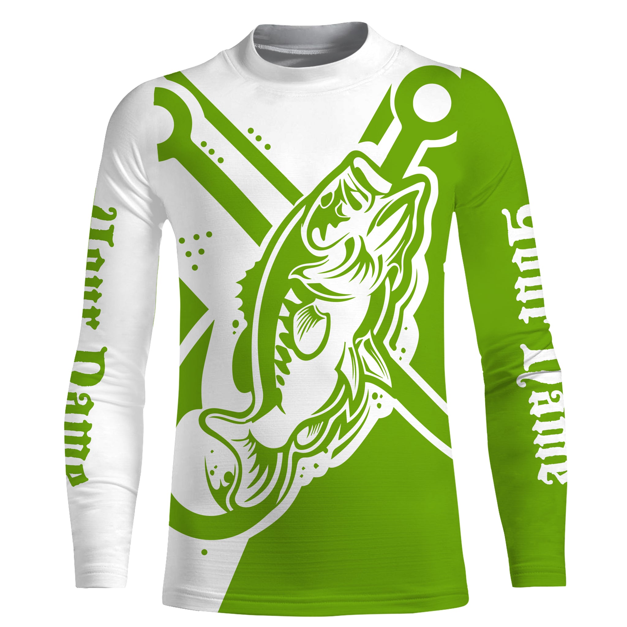 Largemouth bass fishing tattoo fish on Custom Name performance long sleeve fishing shirt | Green NQS3747