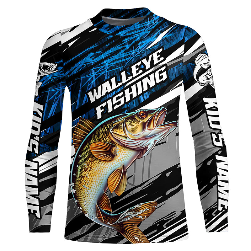 Walleye Fishing Camo Long Sleeve Fishing Shirts, Custom Walleye Tournament Fishing Jerseys | Blue IPHW5957
