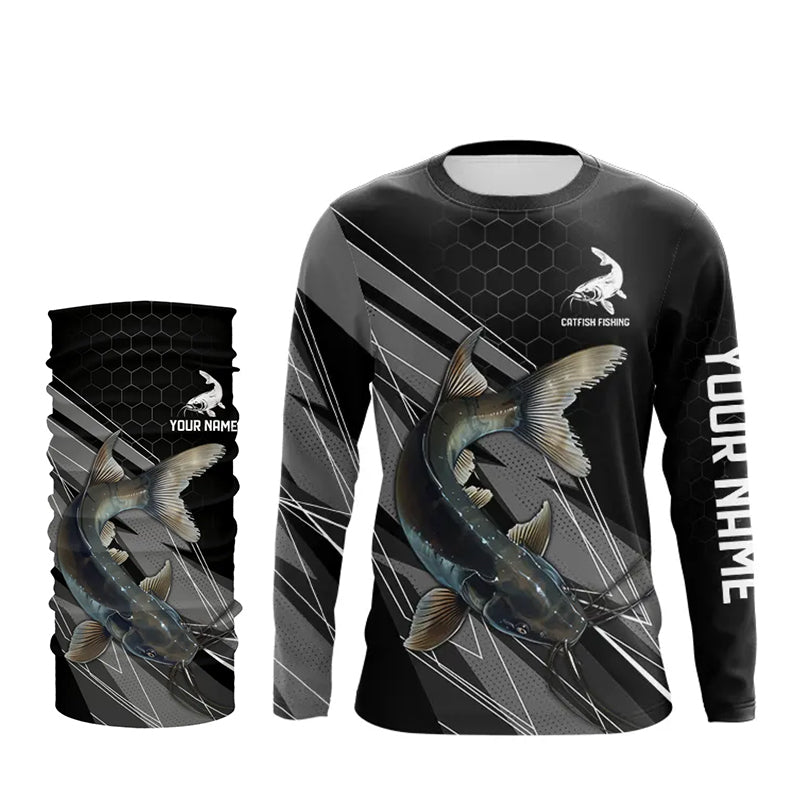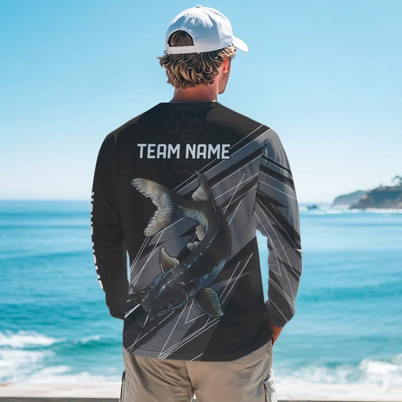 Personalized Black camo Catfish Fishing Jerseys, Catfish Long Sleeve Fishing Tournament Shirts NQS9750