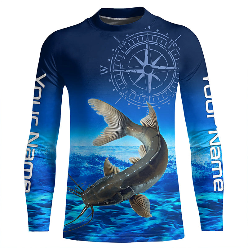 Personalized Catfish Blue Long Sleeve Performance Fishing Shirts, compass Catfish tournament Shirt NQS5984
