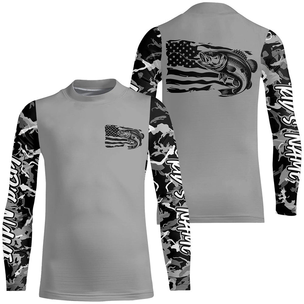Gray Camo Us Flag Largemouth Bass Custom Patrotic Long Sleeve Fishing Shirt, Bass Fishing Jersey IPHW7965