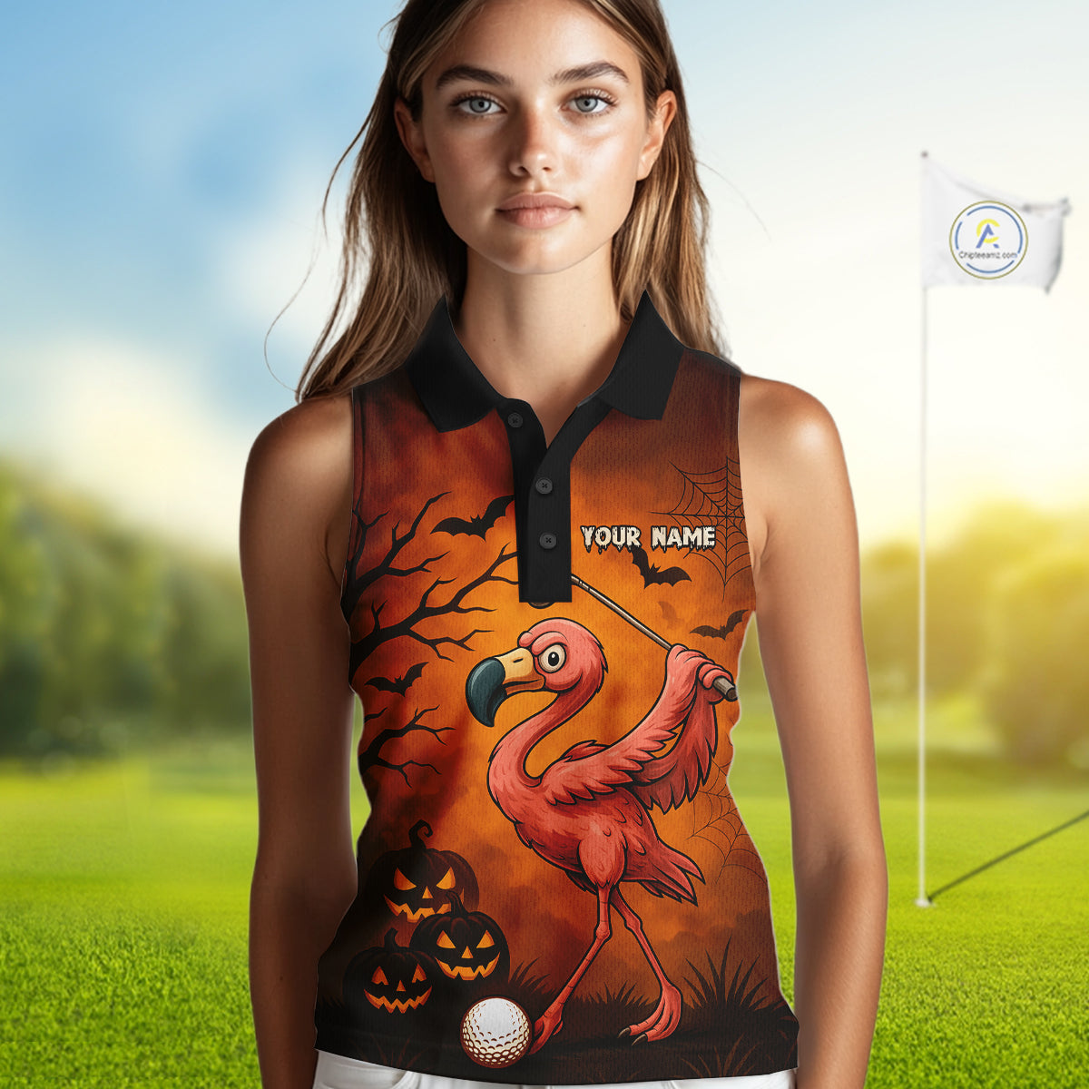 Black and Orange Funny Flamingo Women Sleeveless Polo Shirt Custom Halloween Golf Attire Golfing Gift NQS10701