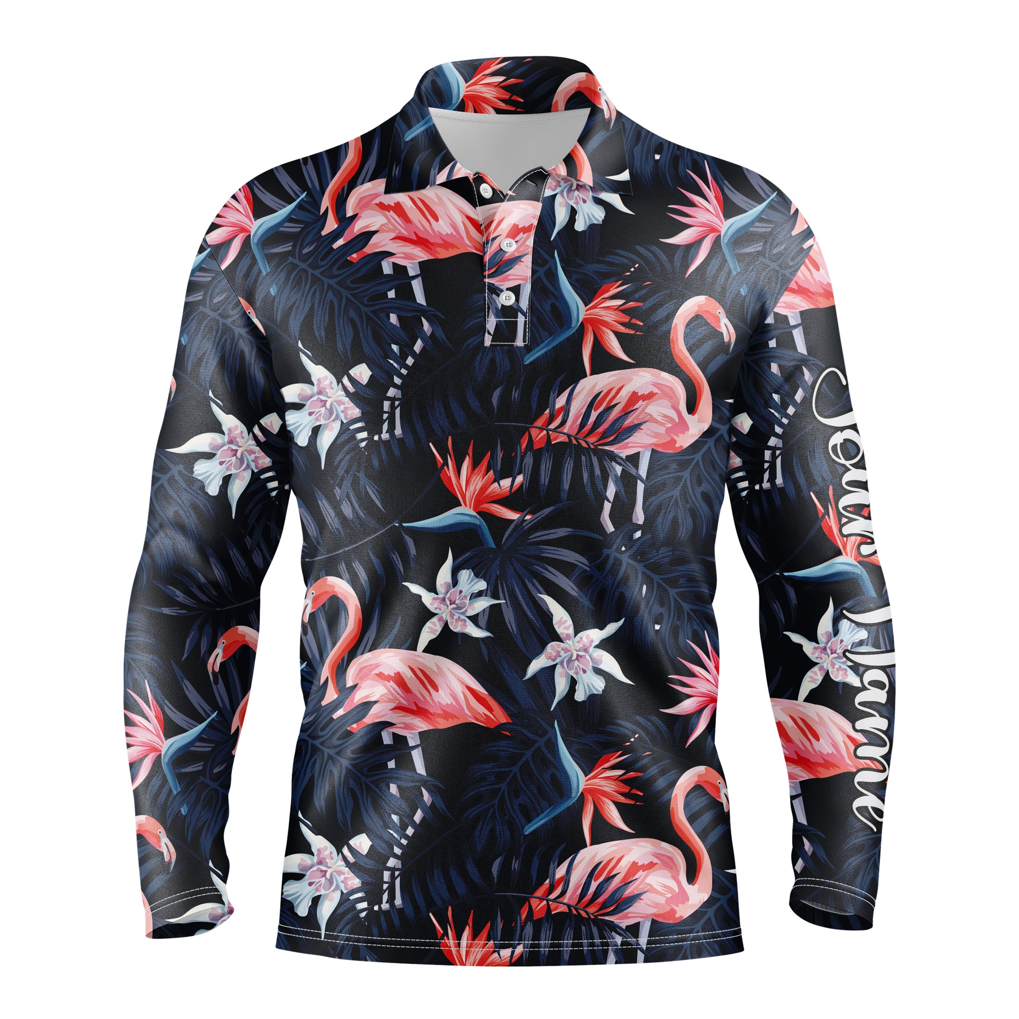 Men golf polo upf shirts tropical birds pink flamingo dark blue palm leaves custom polo shirts NQS3694