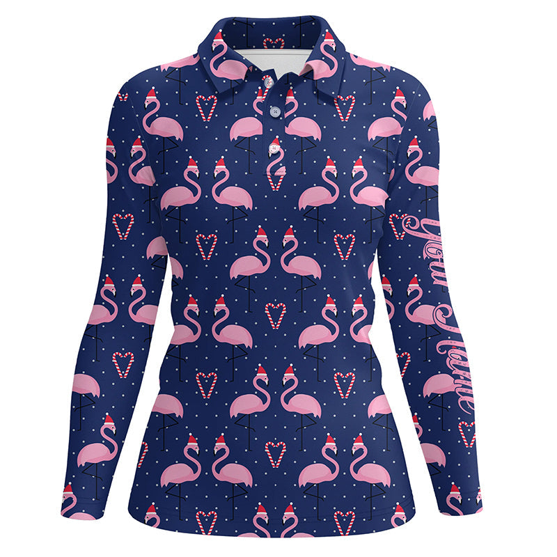 Womens golf polo shirt custom Flamingo Christmas hat with candy cane heart blue background golf gift NQS6721