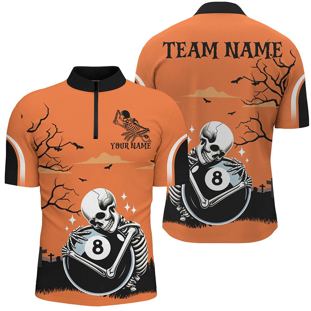 Funny Skeleton Hugging 8 Ball Pool Custom Orange Halloween Billiard Shirts For Men Halloween Outfit TDM2682