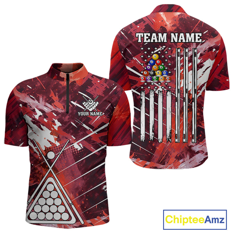 Red Grunge US Flag Billiard Shirt For Men Custom 8 Ball Pool Team Shirt, Funny Billiard Jersey TDM4970
