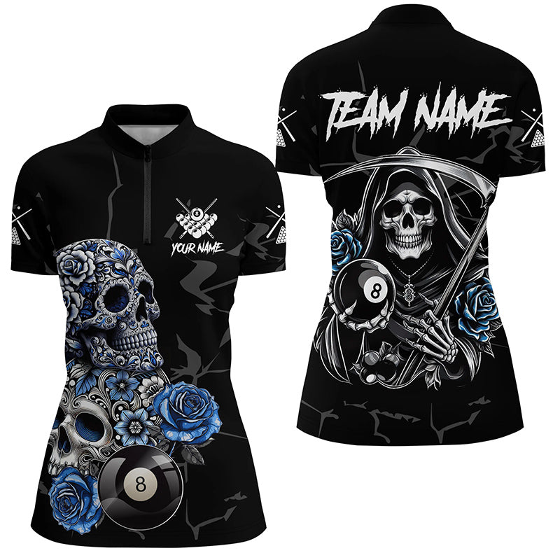 Personalized Funny Blue Skull Roses 8 Ball Billiard Shirts For Women Custom Pool Team Shirts Designs TDM2067