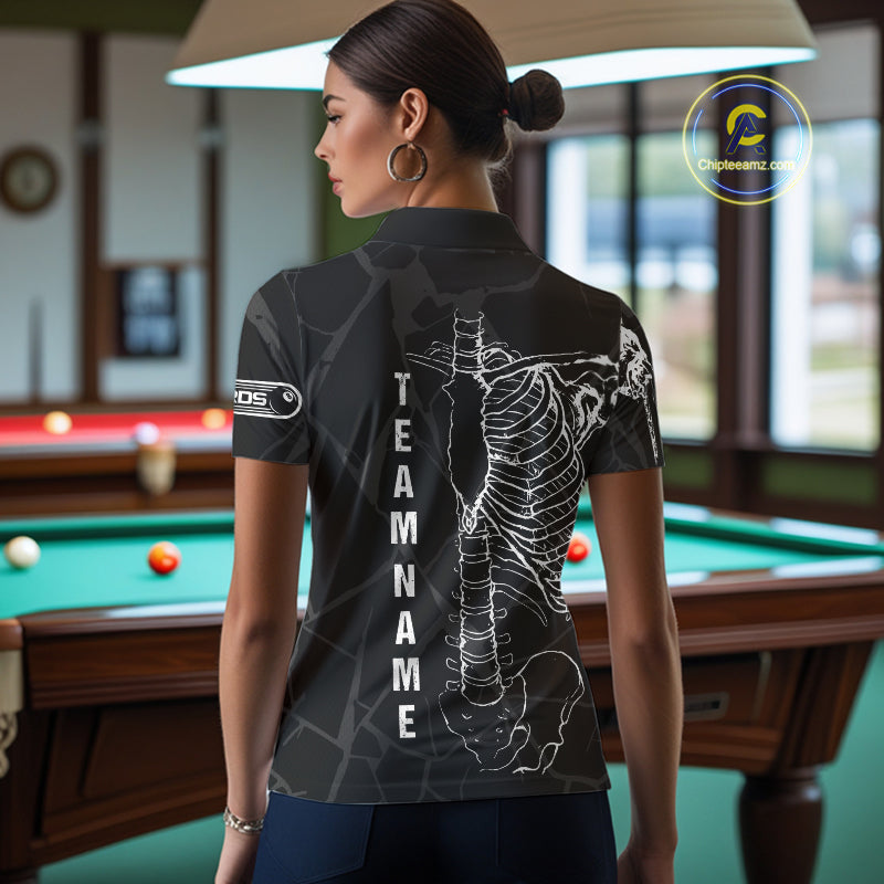 White Skeleton Custom Black Grunge Billiard Shirts For Women, Funny Billiard Jerseys Short Sleeve TDM2723