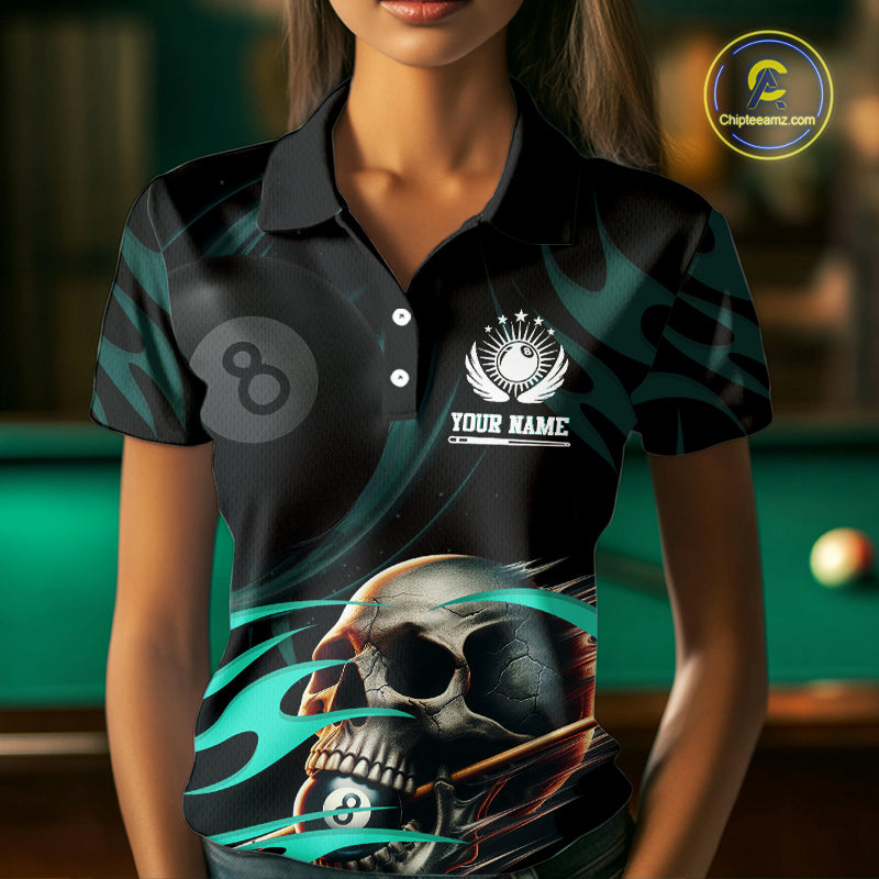 Turquoise Funny Skull 8 Ball Pool Shirt For Women Custom Billiard Team Jersey Polo & 1/4 Zip TDM4424