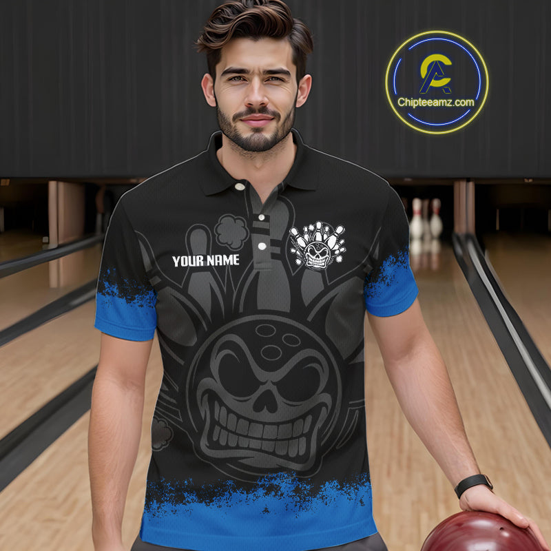 Black and Blue Funny Bowling Polo, Quarter Zip Shirt for Men Custom Bowling Team Jersey NQS9982