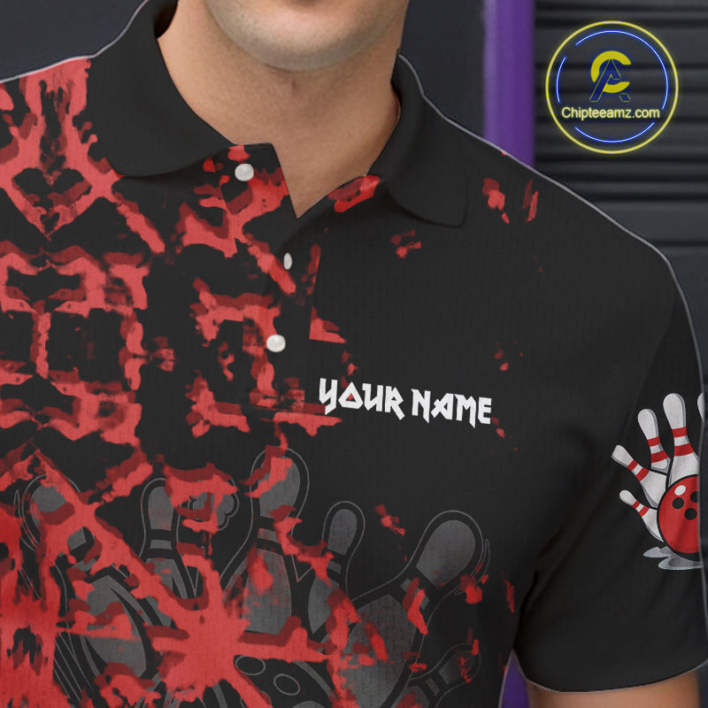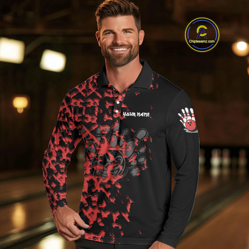 Black and Red Camo Funny Skull Bowling Polo, Quarter Zip Shirt for Men Custom Bowling Team Jersey NQS9969