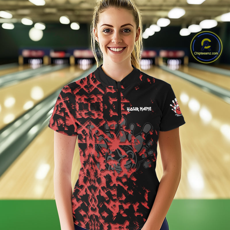 Black and Red Camo Funny Skull Bowling Polo, Quarter Zip Shirt for Women Custom Bowling Team Jersey NQS9969