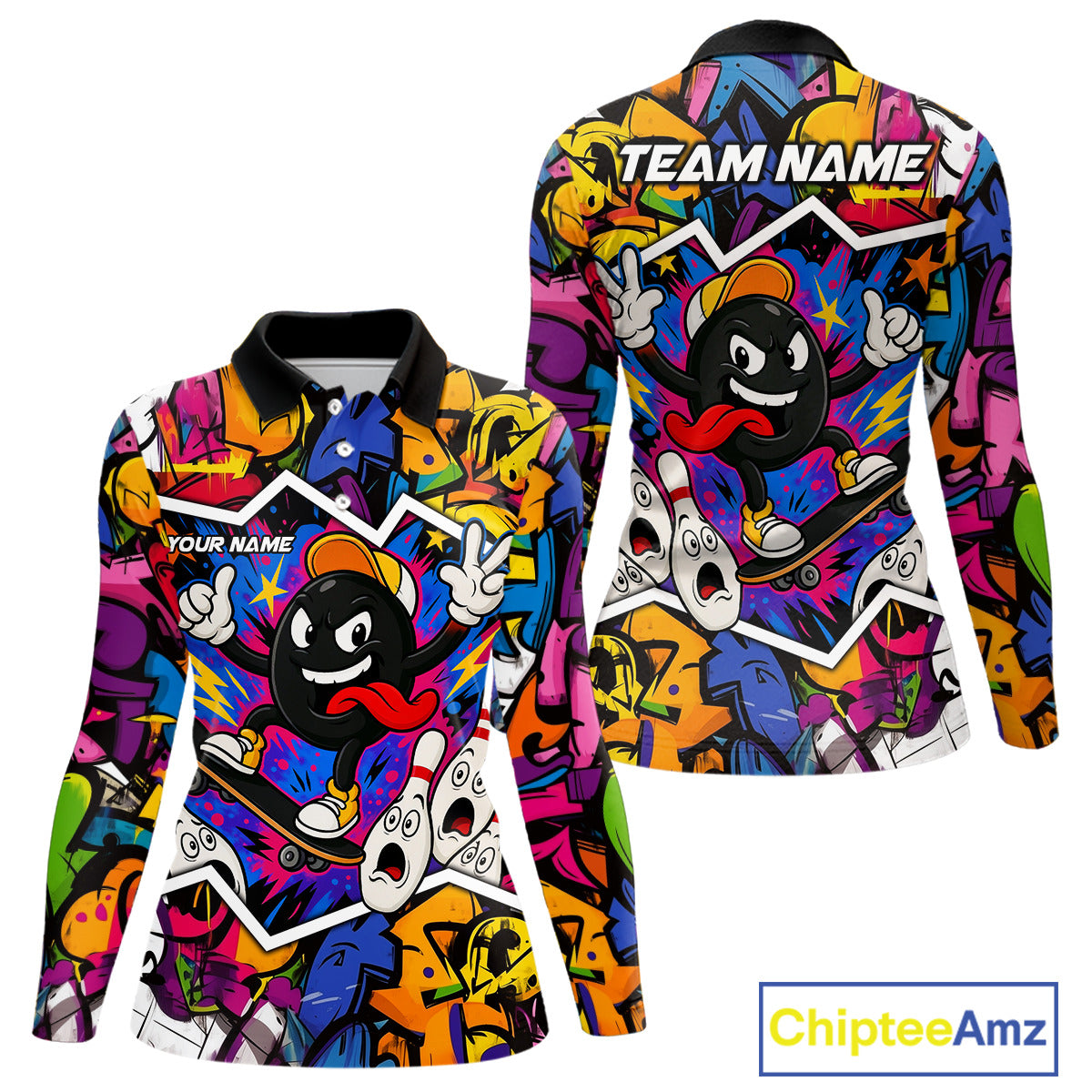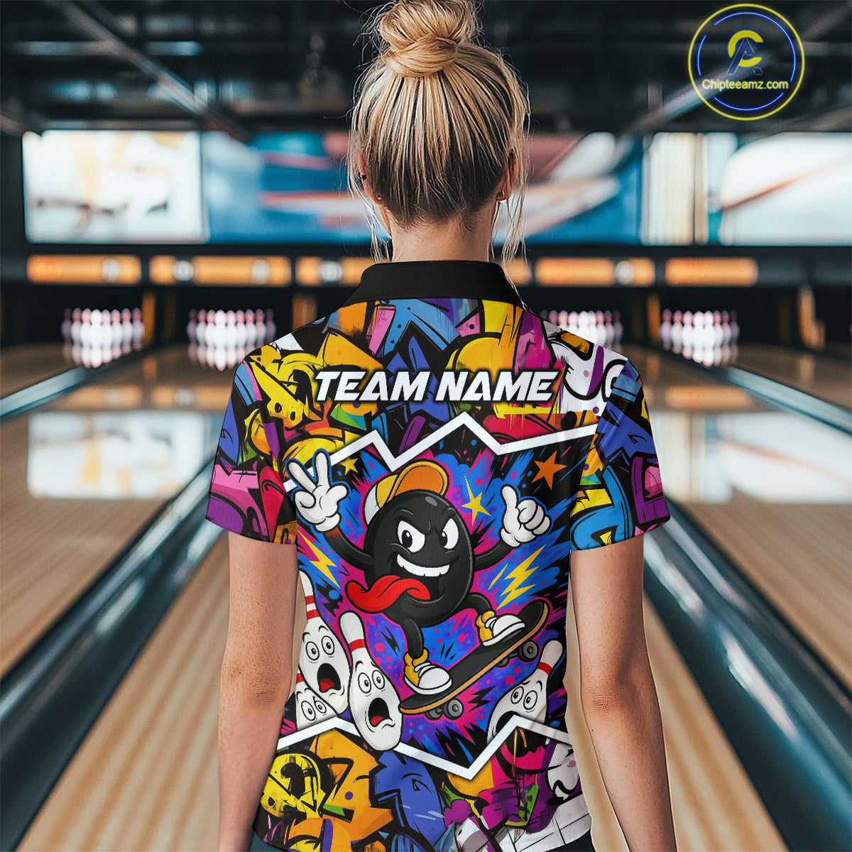 Colorful graffiti pattern Funny Bowling polo, quarter zip shirts for Women custom Bowling team jersey NQS10389