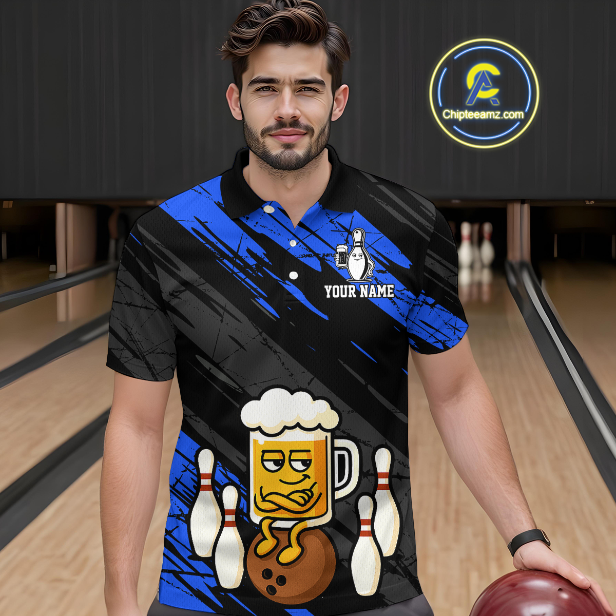 Custom Blue Funny Beer Bowling Jersey for Men Bowling Uniform Polo & 1/4 Zip Bowling Team Shirts HNT107