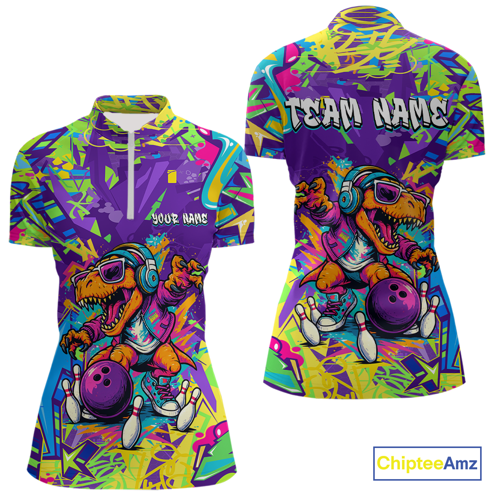Custom Funny Graffiti Dinosaur Bowling Shirt Polo & 1/4 Zip Bowling Jersey for Women Bowling Outfit QZT795