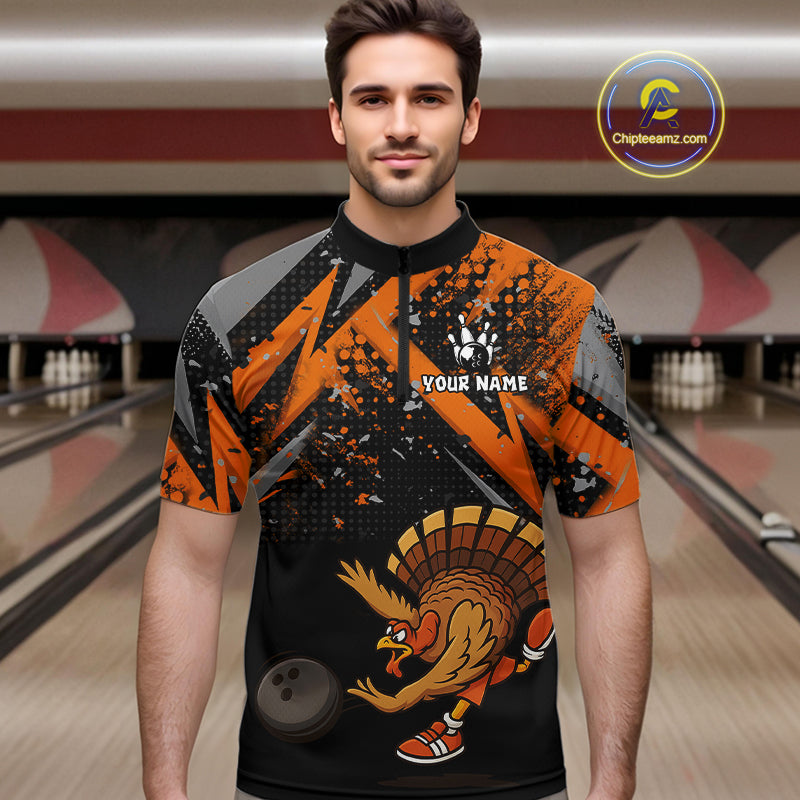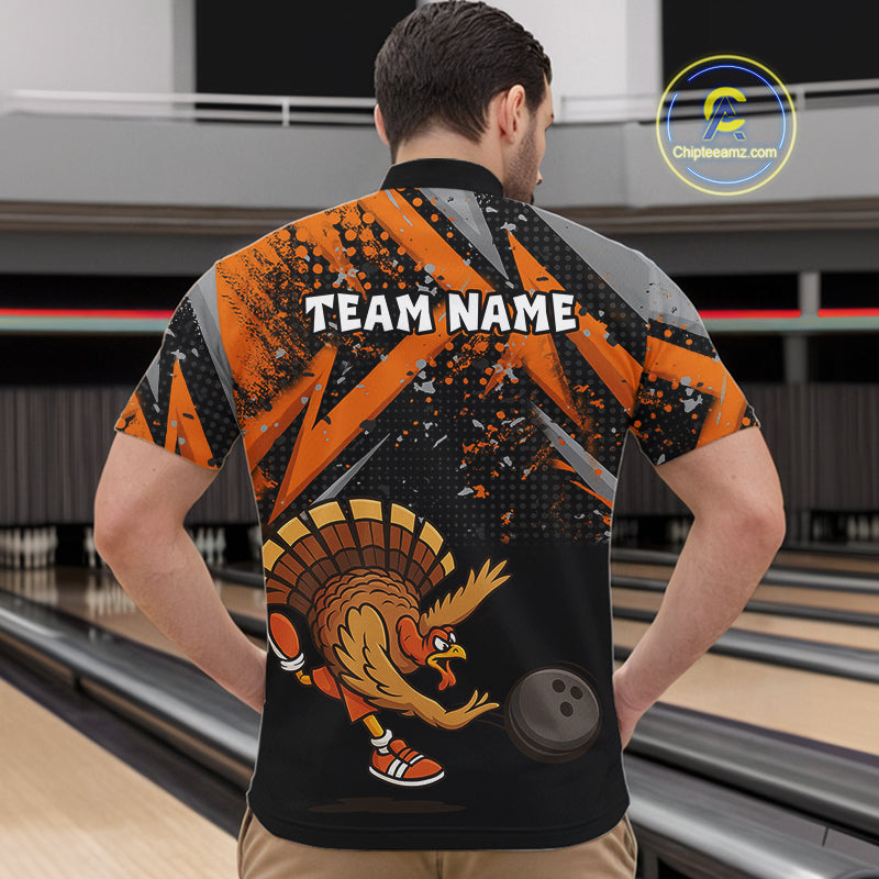 Custom Funny Turkey Bowling Jersey Black and Orange Thanksgiving Bowling Team Men Polo, 1/4 Zip Shirt NQS10671