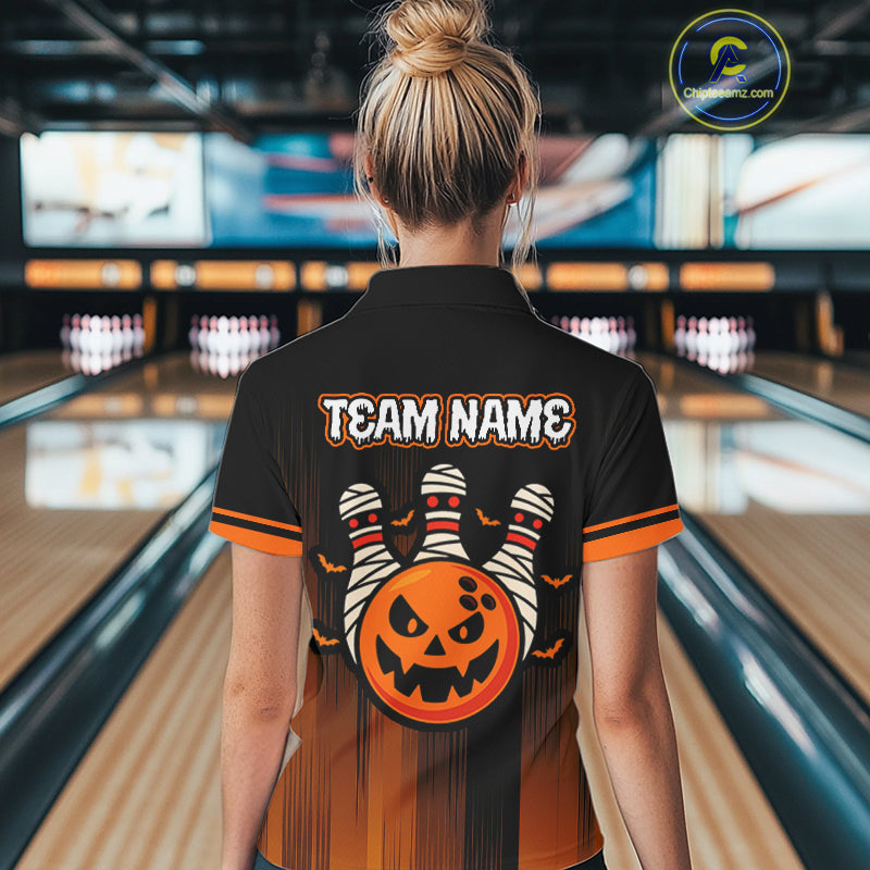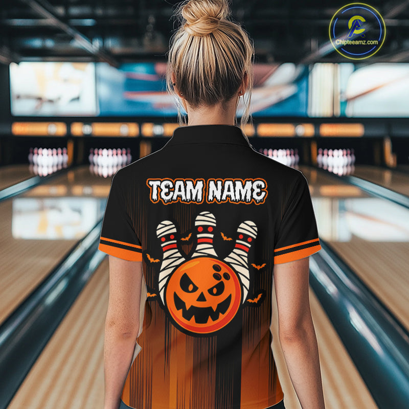 Custom Orange and Black Funny Pumpkin Ball pins Women Bowling Team Shirts, Halloween Bowling Outfit NQS10564