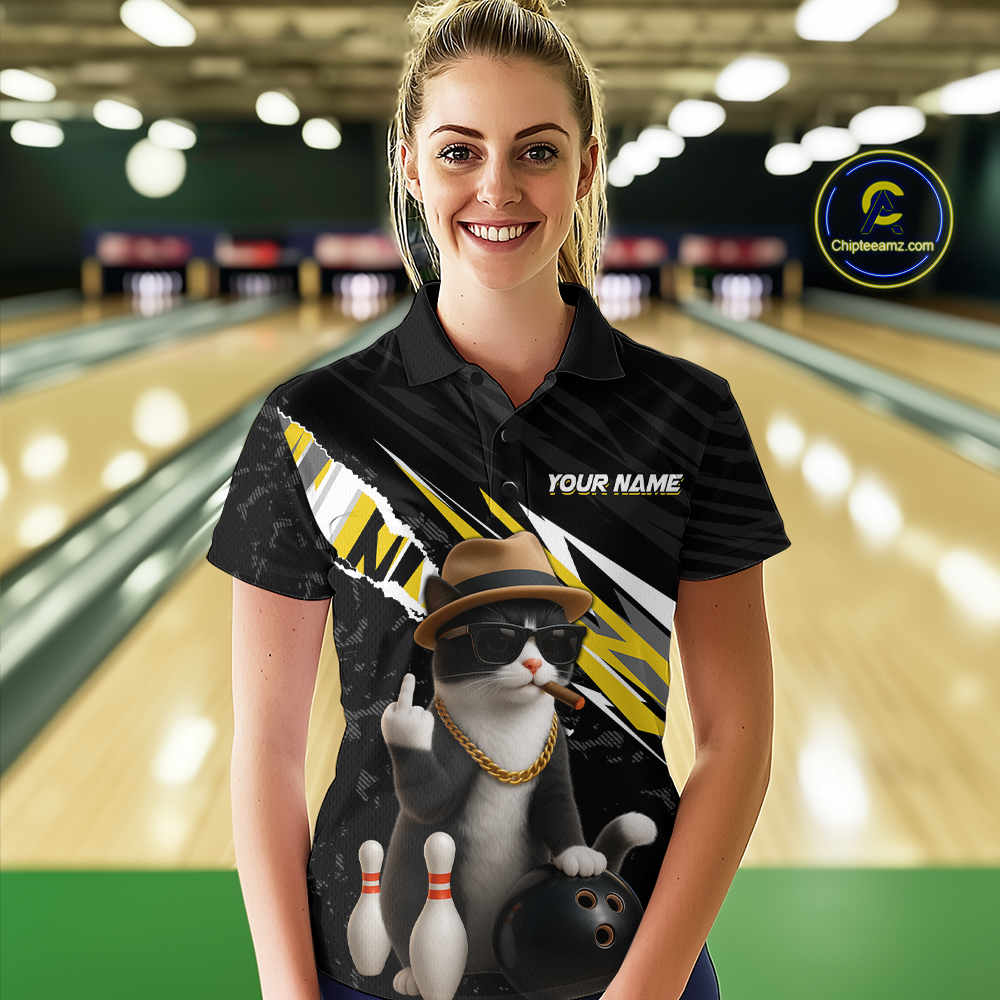 Custom Yellow Funny Cat Bowling Jersey for Women Bowling Shirt Polo & 1/4 Zip Bowling Team Shirts HNT136