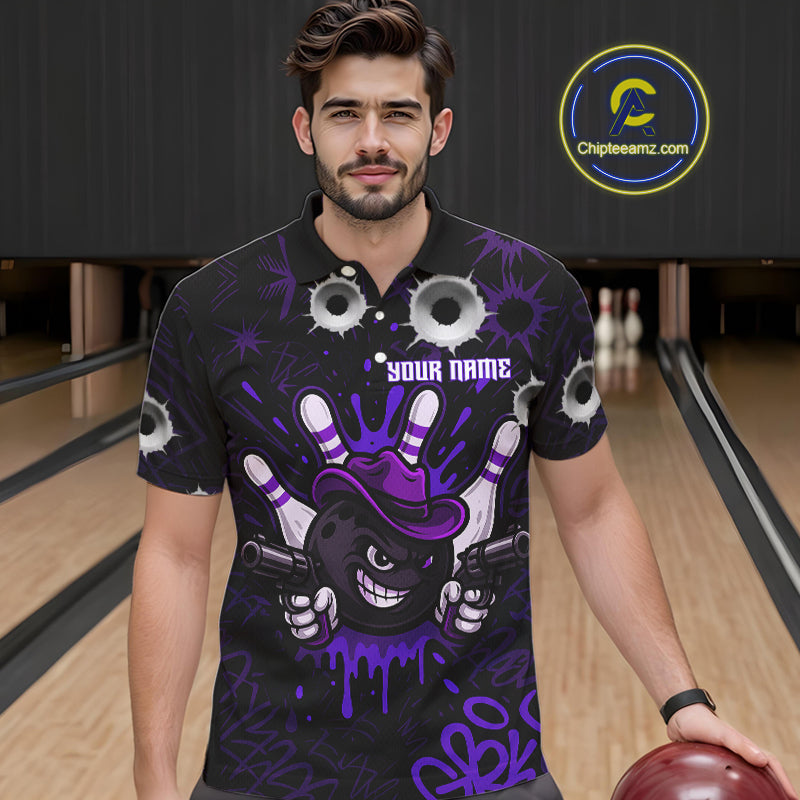 Funny Black and Purple Bowling Cowboy gun Men bowling polo, 1/4 zip shirts Custom bowling team jersey NQS10659