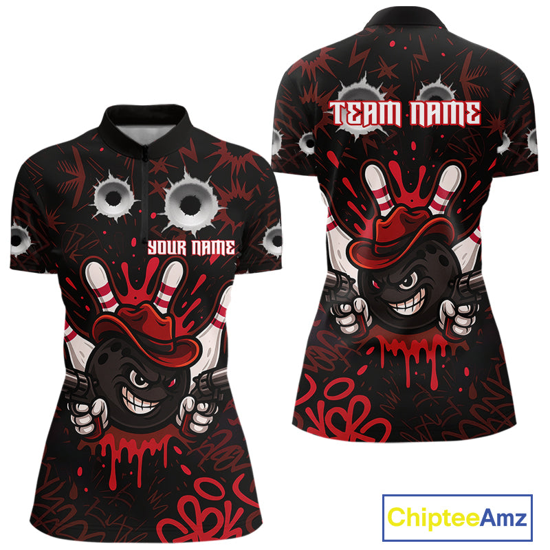 Funny Black and Red Bowling Cowboy gun Women bowling polo, 1/4 zip shirt Custom bowling team jersey NQS10690